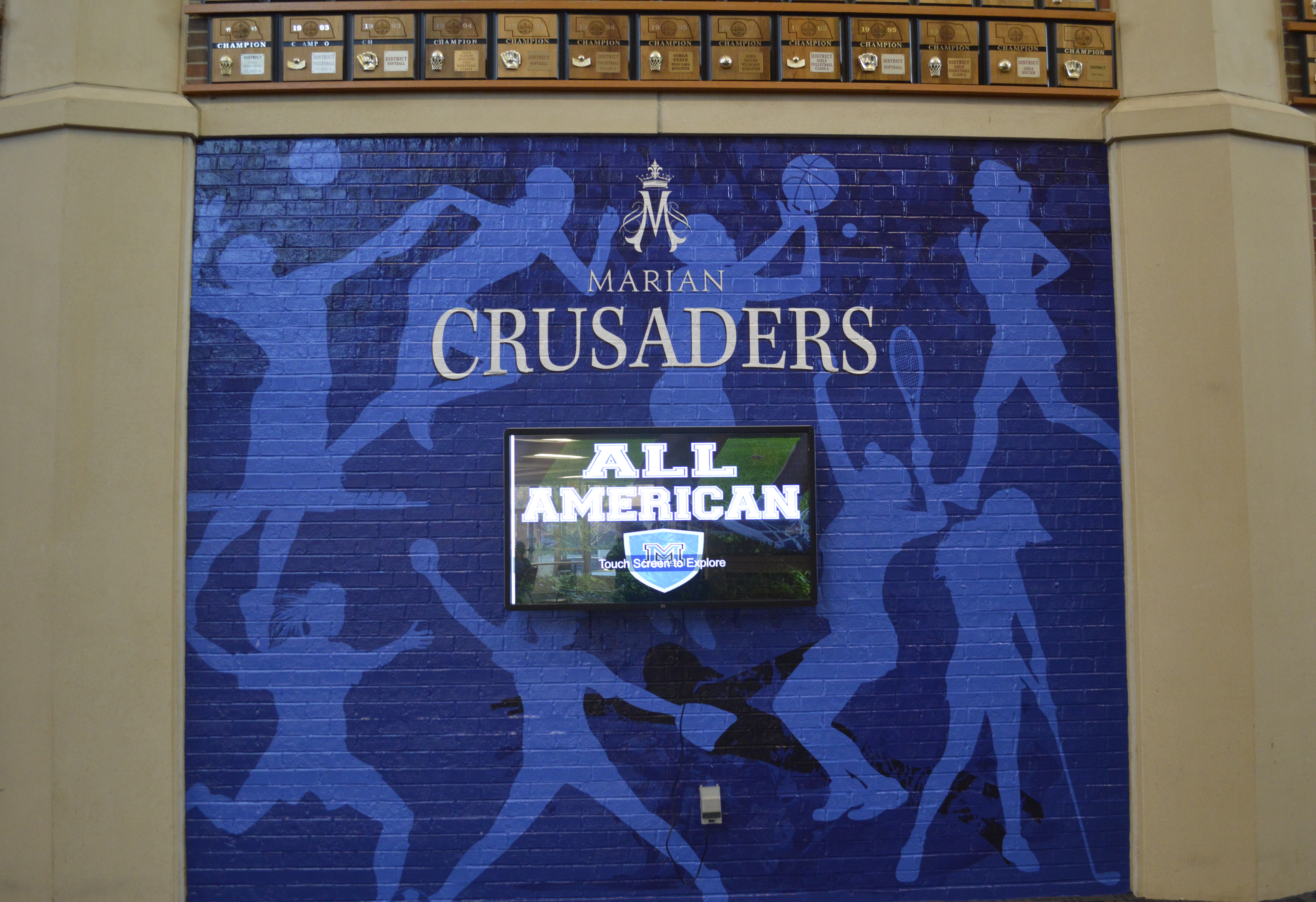 Marian has decided to go for a more simplistic “Wall of Fame” and has taken down all of the plaques with the athletes’ photos. As you walk down the quad steps you now see the brick wall with a custom blue background featuring the silhouettes of athletes performing their specific sport.