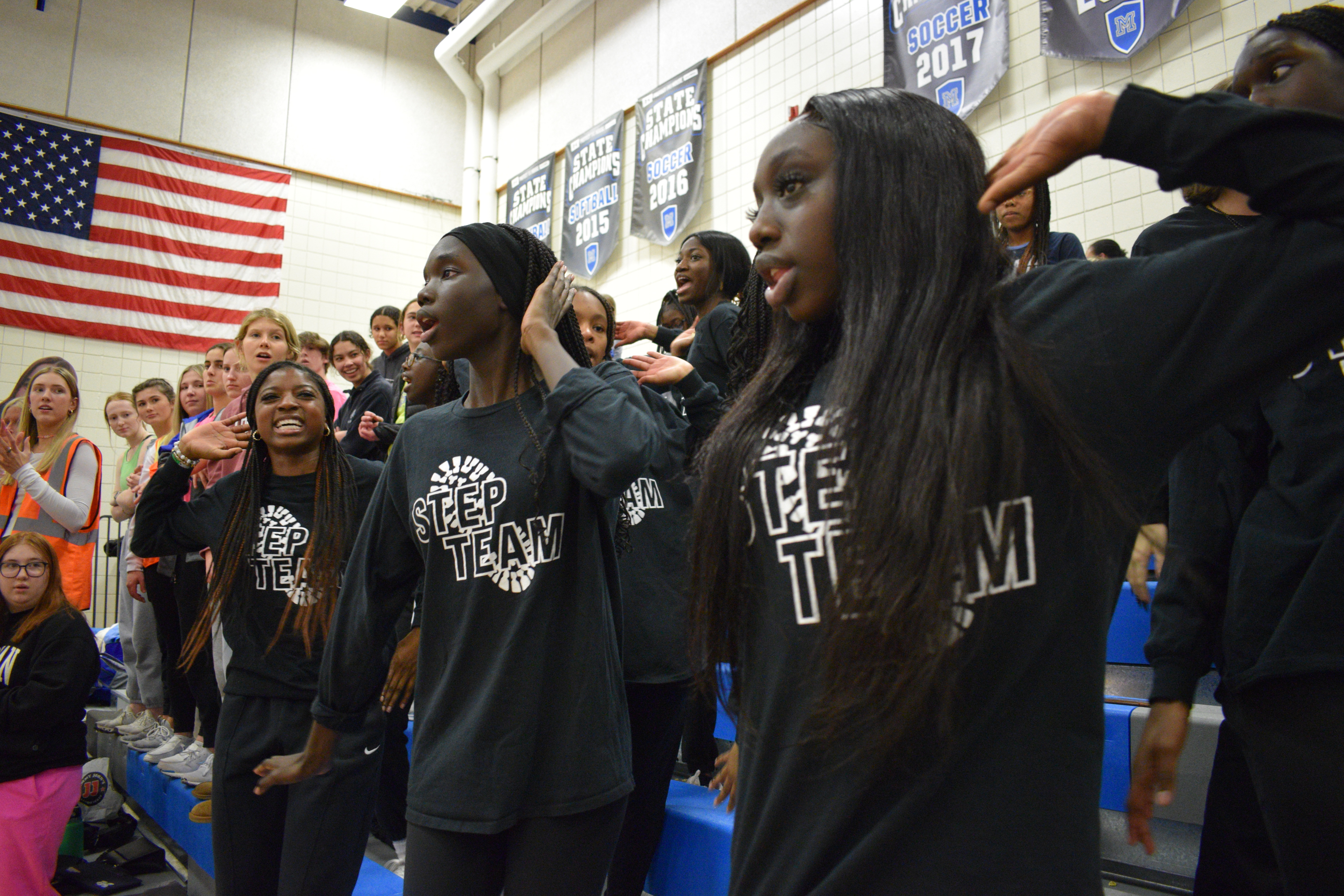 Powerful voices echo throughout the gym during Marian’s home basketball games as the Marian Step Team performs a variety of routines. Their performances include multiple complex step routines and two to three songs they step to.