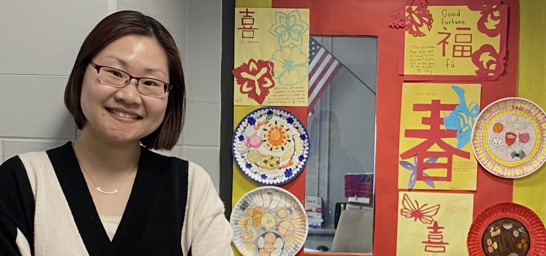 Mandarin teacher Mrs. Sicong Mills poses outside of her classroom. The door is decorated with each of her classes’ projects for the Spring Festival. Photo by MadisonShaffar.